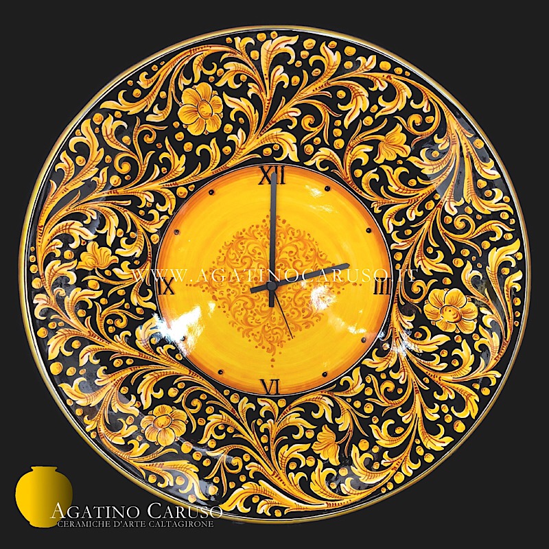 Piatto ad orologio in ceramica artistica minuziosamente dipinto a mano. Decorato con ornato Caruso in giallo ocra su fondo nero lucido. Smalto lucido crema brillante. Decori e misure personalizzabili.