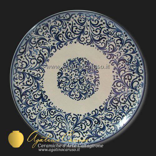 Piatti decorati con motivo floreale Elena in monocromia blu cobalto fantasia due. Maioliche siciliane minuziosamente decorate a mano. Adatto sia per interni che per esterni. E’ possibile personalizzare sia i decori che le misure. Predisposto per essere appeso a muro.