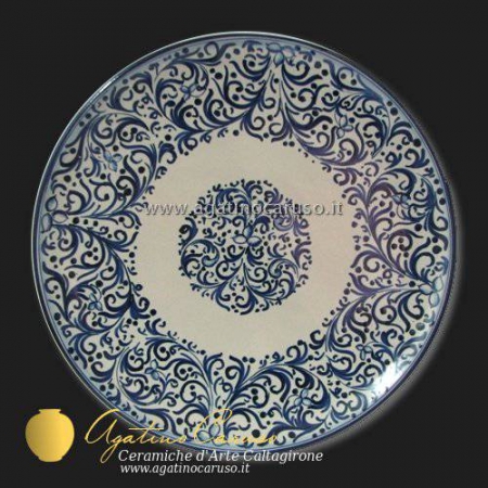 Piatti in ceramica artistica minuziosamente dipinto a mano. Decorato con motivo floreale Elena in monocromia blu cobalto fantasia uno. Disegno con dea centrale. Smalto antico satinato. Adatto sia per interni che per esterni. Decori e misure personalizzabili.