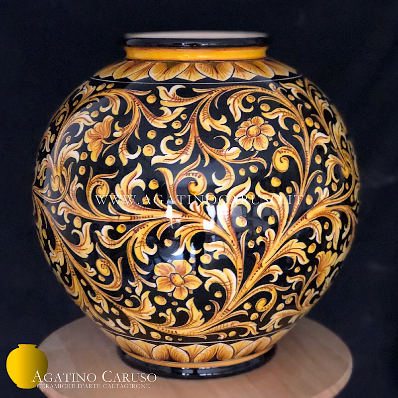 Vaso in ceramica di Caltagirone fondo nero dipinti a mano. Vaso a boccia decoro ornato fondo nero. Smalto lucido crema brillante. Maioliche siciliane minuziosamente decorate a mano. Adatto sia per interni che per esterni. E’ possibile personalizzare sia i decori che le misure.