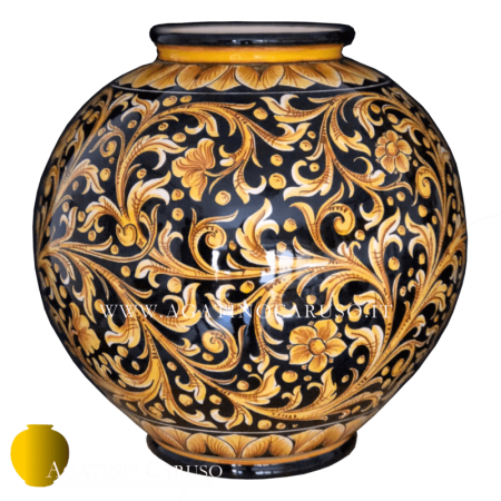 Vaso in ceramica artistica minuziosamente dipinto a mano. Vaso a boccia decoro ornato fondo nero. Smalto lucido crema brillante.Adatto sia per interni che per esterni. Decori e misure personalizzabili.