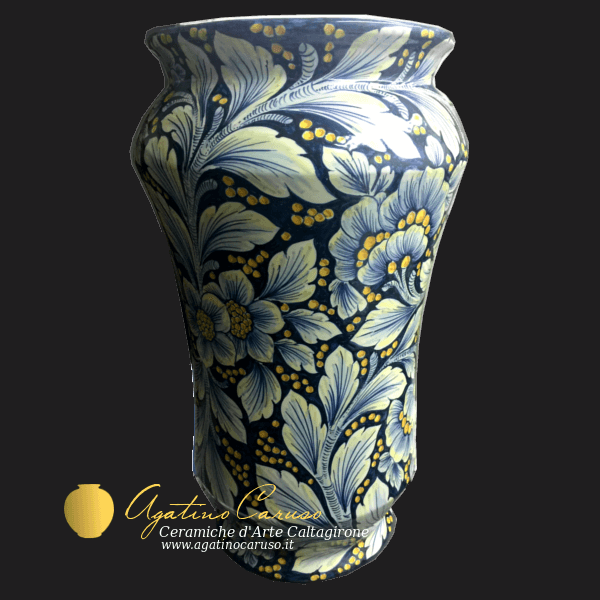 Vaso Portaombrelli ceramica artistica dipinti a mano. Decoro ornato Dalia fondo blu cobalto. Smalto antico satinato. Maioliche siciliane minuziosamente decorate a mano. Adatto sia per interni che per esterni. E’ possibile personalizzare sia i decori che le misure