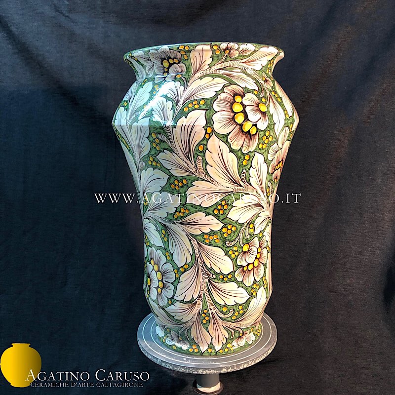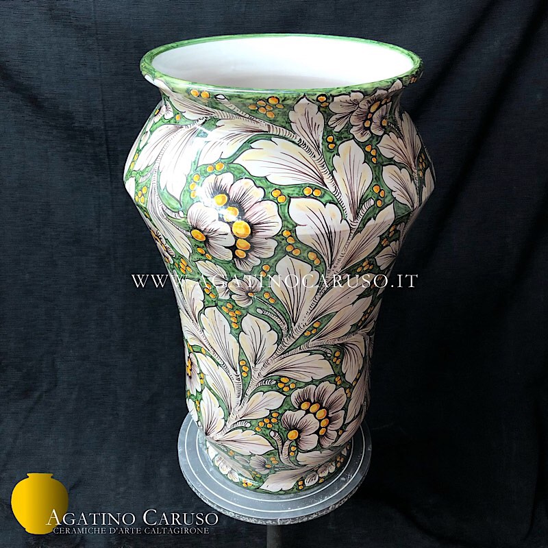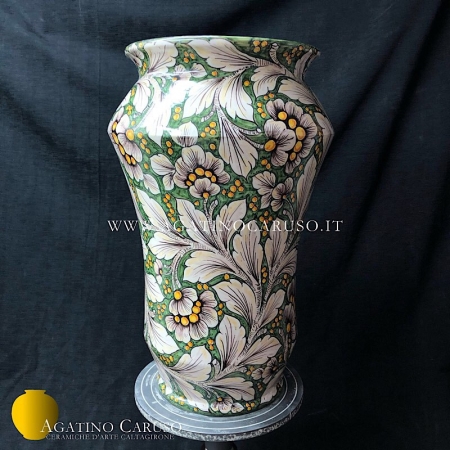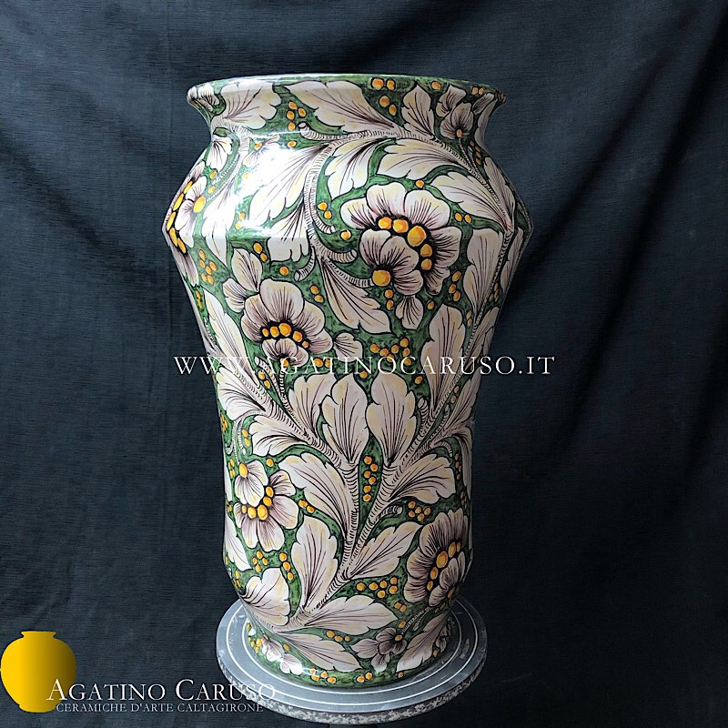 Vaso portaombrelli in ceramica artistica minuziosamente dipinto a mano. Decoro Dalia fondo verde ramina. Smalto antico satinato.Adatto sia per interni che per esterni. Decori e misure personalizzabili